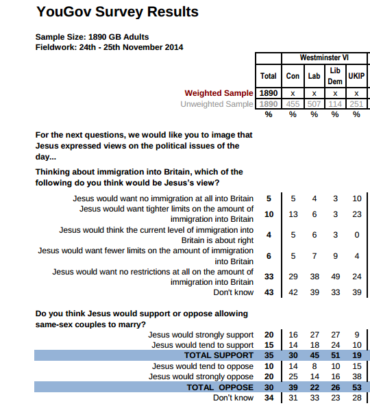 Full tables are here, which also has a breakdown of the results by declared religious standpoint. Not surprisingly, those of 'no religion' think Jesus would be more likely to support gay marriage than either Christians or those of other religions. And I can't get my head around the 1 in 20 'Christians' who think that Jesus (refugee to Egypt) would want no immigration at all into the UK. I suspect we are dealing with a spectrum of understandings of what 'Christian' means!